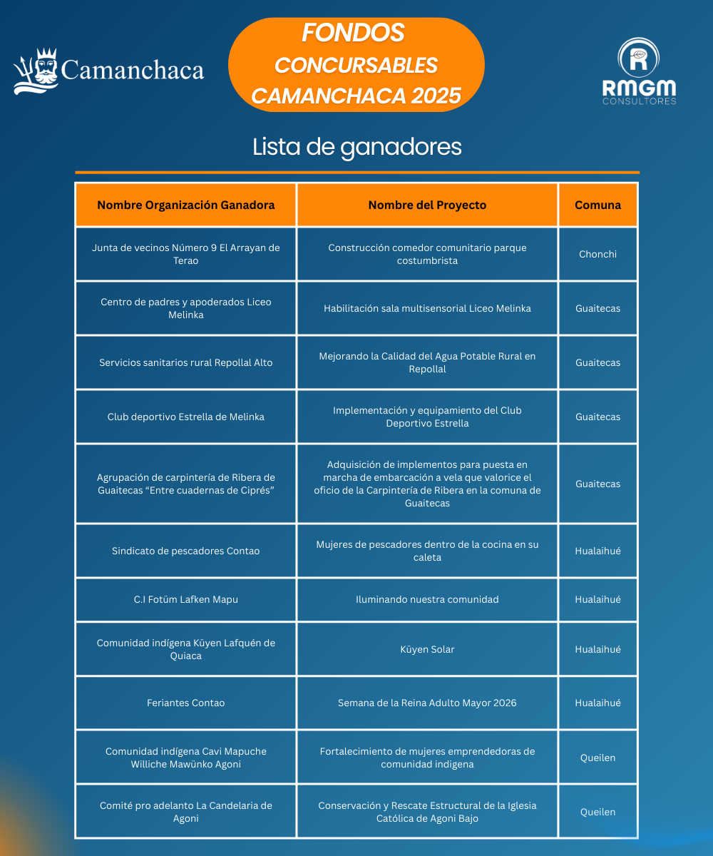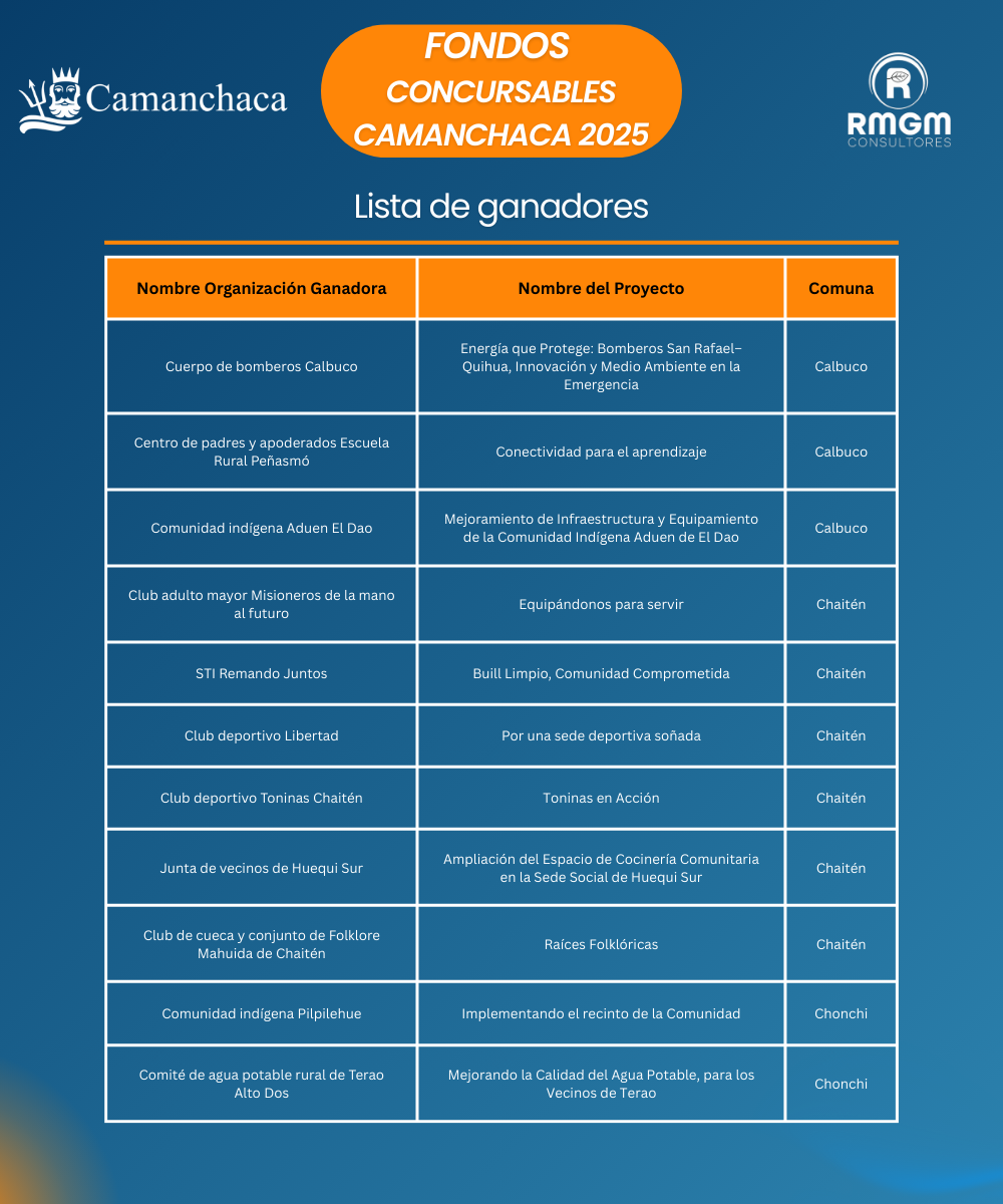 Camanchaca desde su área de Relacionamineto Territorial junto a RMGM consultores Agradecemos profundamente la participación, compromiso y motivación de todas las organizaciones que postularon.